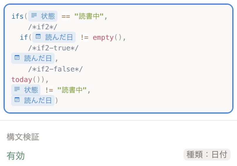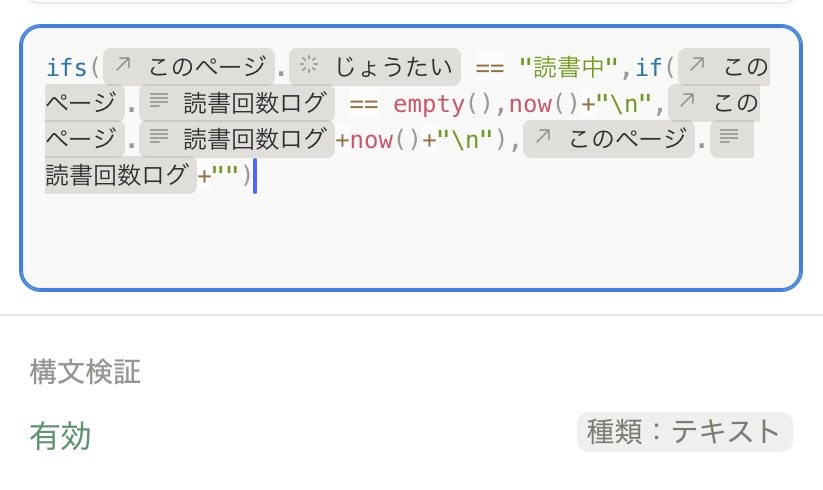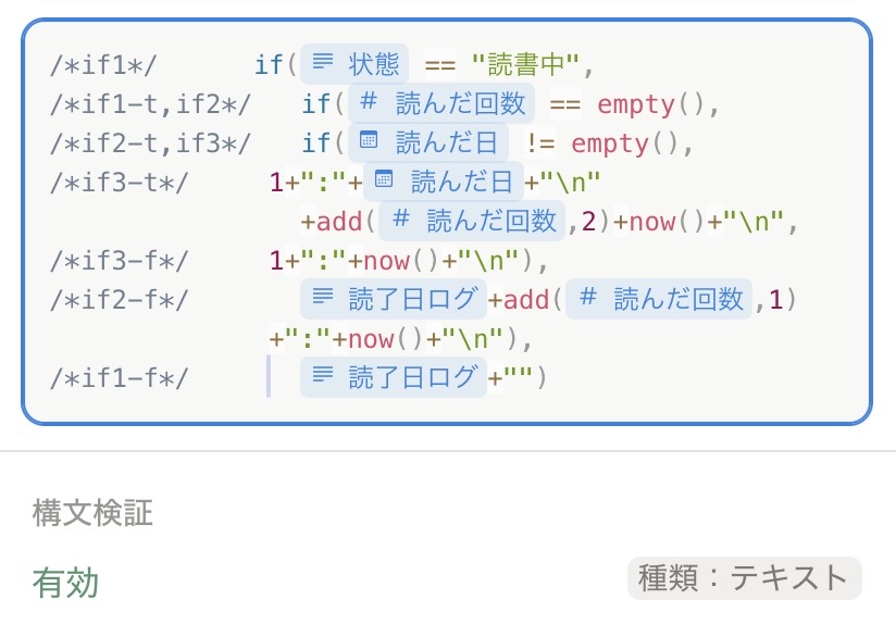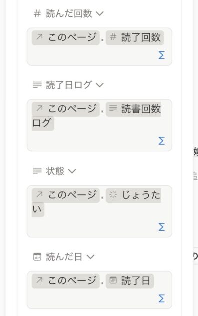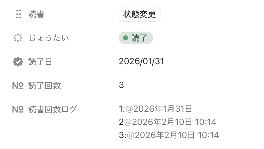 その結果、私の技術ではそのまま関数のみで実装するのがむずかしかったので、改めて読了回数をカウントするプロパティを用意(読了回数、数字プロパティ)。